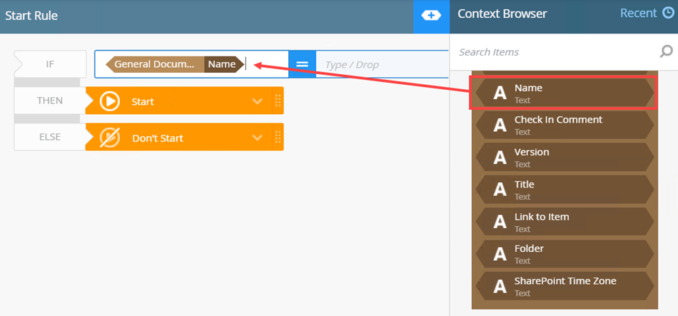 - In this scenario, you need to specify that if a document (containing the word purchase order in the Name field) is added to the General Documents library, the workflow should start. To do this you use the Name reference. From the Context Browser locate the Name reference and drag it into the condition.