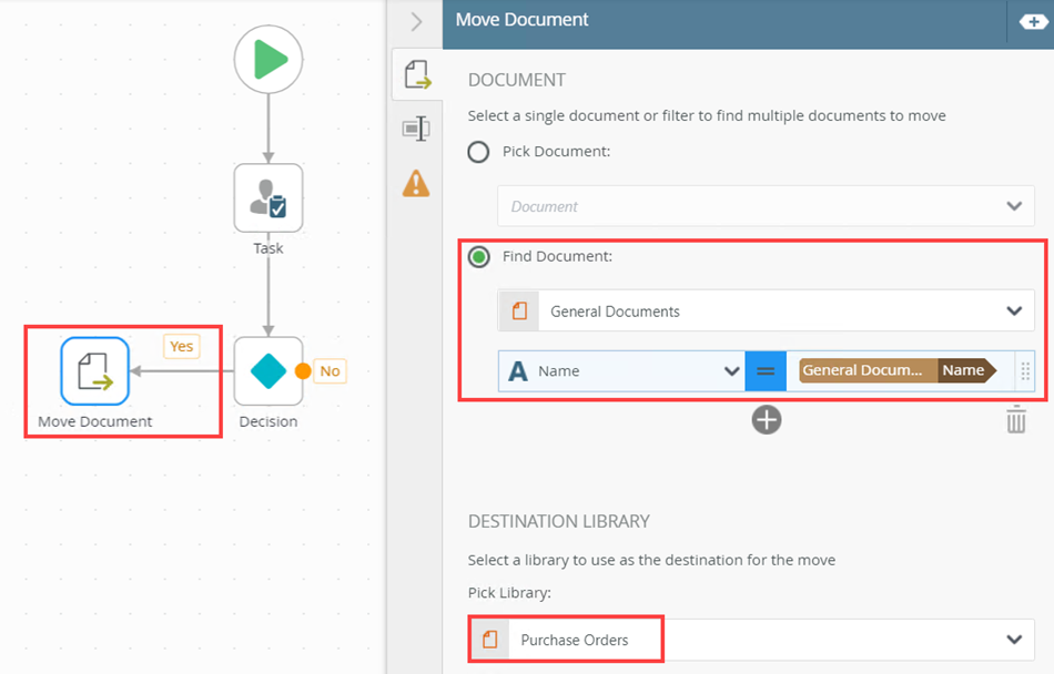 - From the Toolbox, click the SharePoint category then the Document category and drag the Move Document step onto the canvas. Connect the step to the Yes task action. You use the Move Document step to specify what happens to the document. In this case, it is moved from the General Document library to the Purchase Order library. Configure the step as shown below.