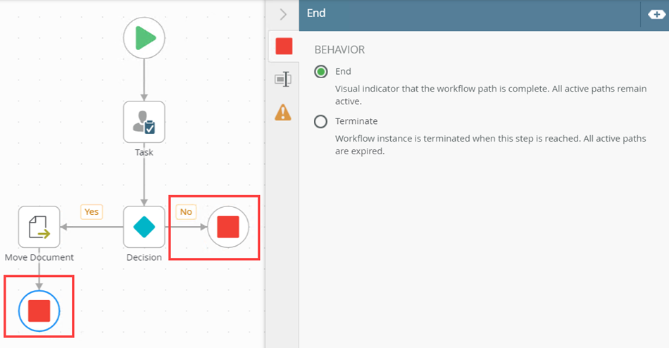 - From the Toolbox, click the Logic category and drag the End step onto the canvas. Connect the step to the No task action. Drag another End step and connect this one to the Move Document step.