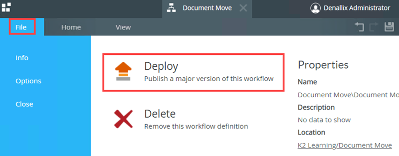 - The final thing to do is to deploy your workflow. From the File menu select Deploy.