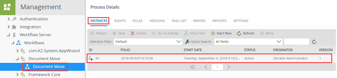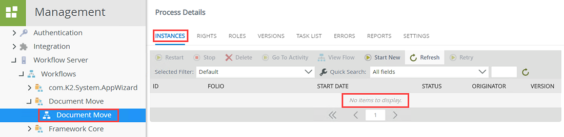 - The conditional start rule evaluates the name of the document and because it contains the words Purchase Order the condition is met and the workflow starts. From K2 Management, locate the Document Move workflow and select the Instances tab. Notice that workflow has started.