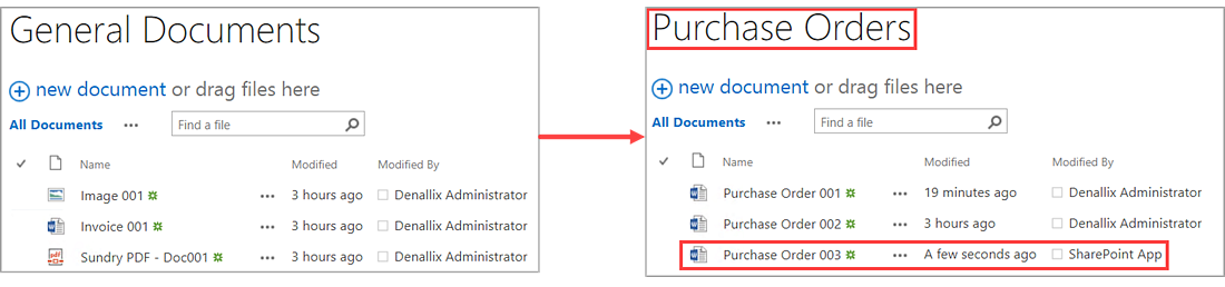 - In this scenario a task is sent to a recipient. The recipient select the Yes action and the Purchase Order 003 document is moved from the General Documents library to the Purchase Orders library.