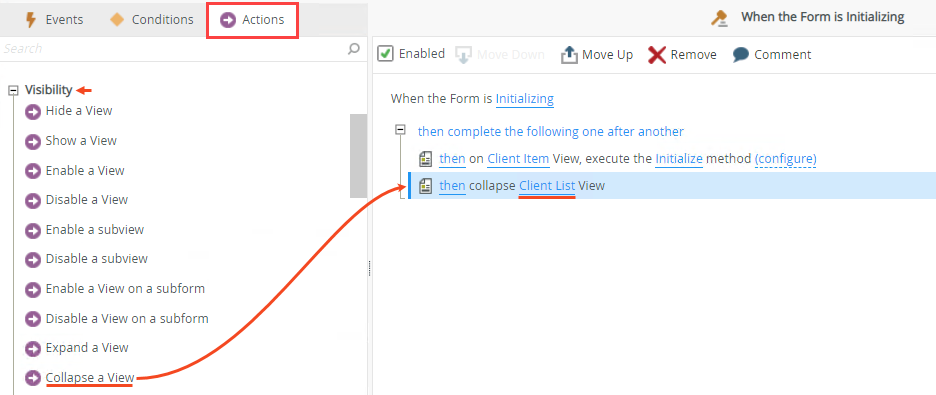 You can use the Collapse and Expand view rule events and actions to control when views should expand or collapse, and what to do when a view expands or collapses. For example, you can use actions to populate a view with data on-demand; in other words, instead of loading a view with data when the form initializes, only load the data in the view if the person expands the view. This can help to improve form performance by delaying loading data until the person wants to see the data. You can use the Load and Initialize methods when the view is expanded instead of when the form initializes, to minimize the delay time when a form opens.