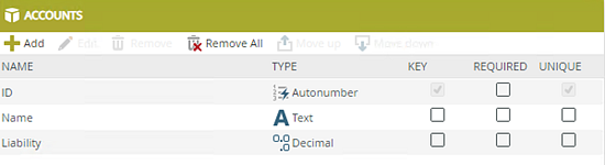 Accounts SmartObject Type Key Required Unique ID Autonumber Yes No Yes Name Text No No No Liability Decimal No No No