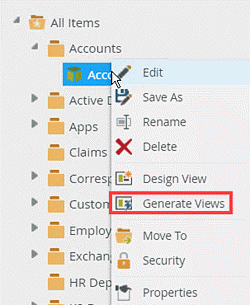 - From the category tree, right click the Accounts SmartObject and click Generate Views.