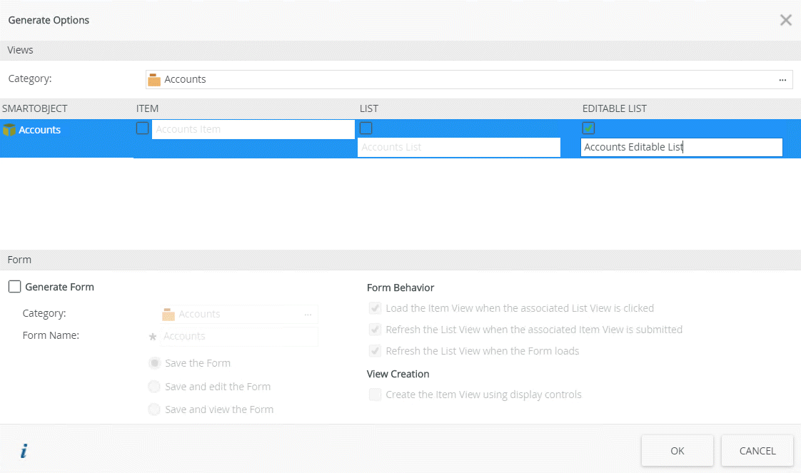 - On the Generate Options page, in the Views section, make sure that the view is generated in the correct category (in this example, Accounts). Check the Editable List check box for the Accounts SmartObject and then click OK.