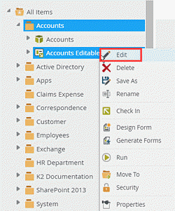 - From the K2 Designer, right-click the Accounts Editable List view and select Edit.