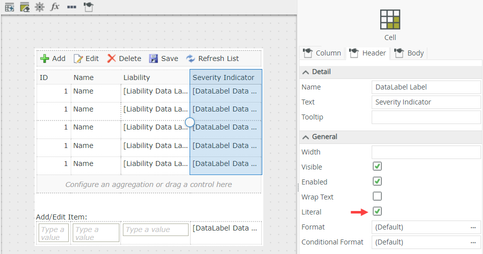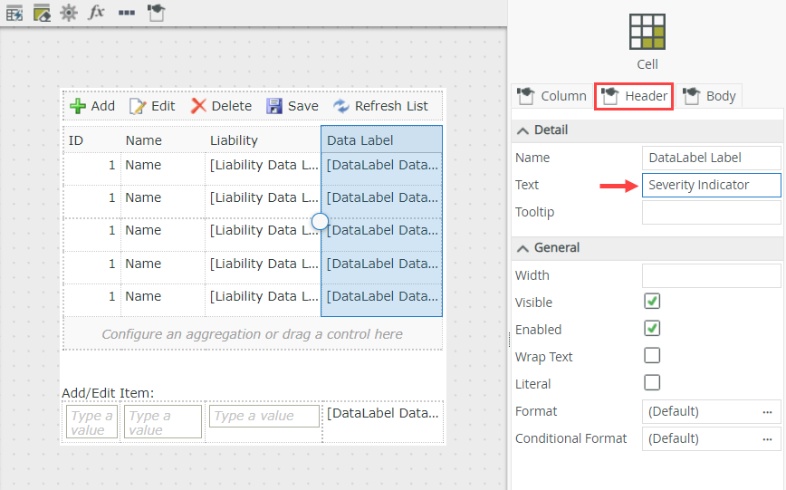 - Select the Header tab in the control's properties and then rename the data label to Severity Indicator.
