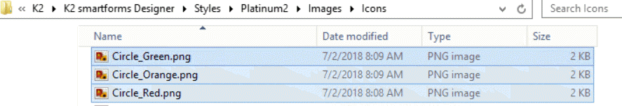 In the example, red, green, and orange circle images are used. (For demonstration purposes, the images are physically located at C:\Program Files (x86)\K2\K2 smartforms Designer\Styles\Platinum2\Images\Icons, but they can be located in a different location that is accessible to the SmartForm runtime site).