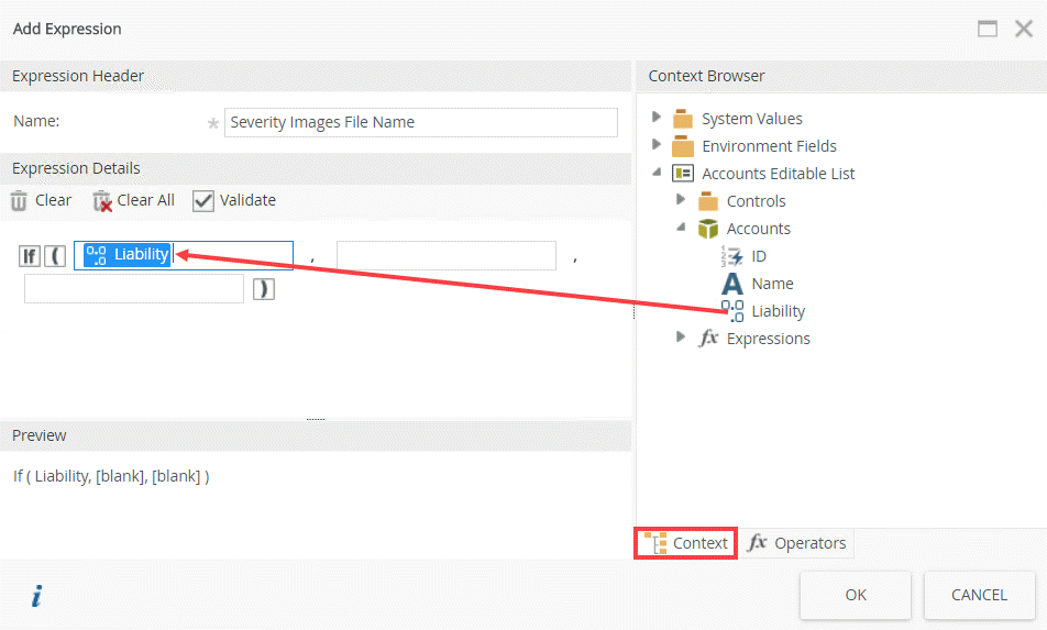 - Click the Context tab and then drag the Liability field of the Accounts SmartObject into the drop zone as shown below.