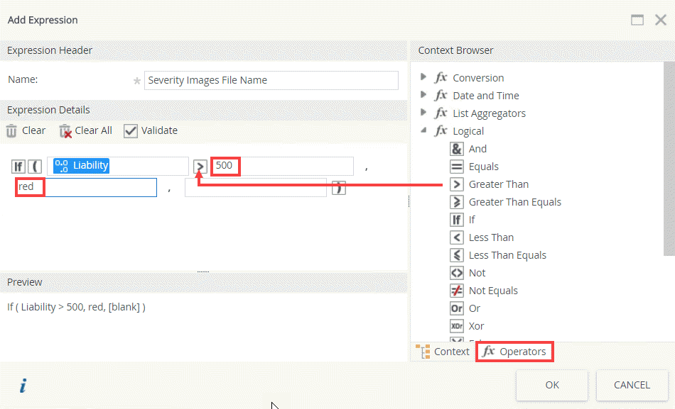 - Do the same to add the rest of the condition as shown below. Check the Preview to see if your statement is correct. This expression evaluates your condition and returns an image file name.