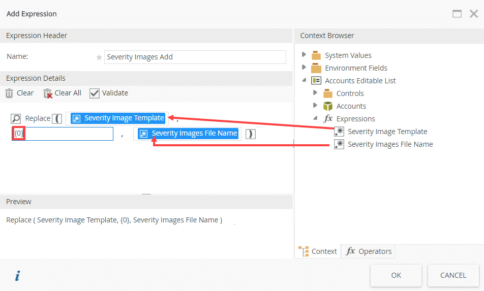 - Click the Context tab, expand the Expressions node under the Accounts Editable List and then drag the two expressions into the drop zones as shown below. Type {0} in the drop zone in the middle. This expression replaces the {0} placeholder.