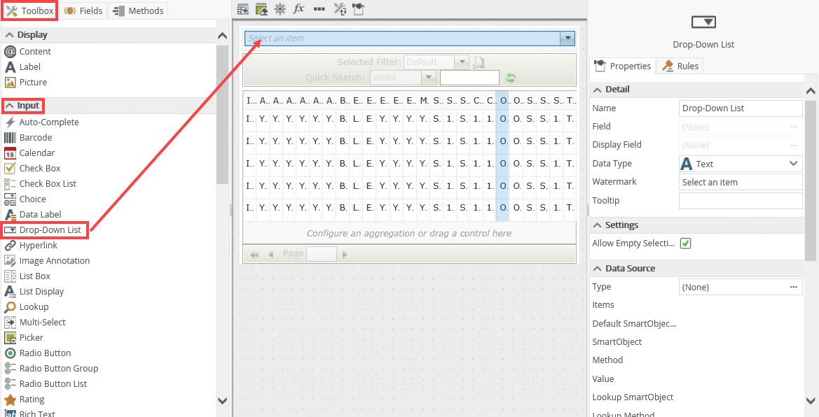 - Drag the Drop-Down List control onto the canvas. The control is available in the Input section of the Toolbox.