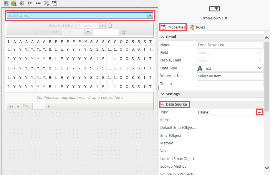 - Select the Drop-Down List control by clicking on it. Click the ellipsis next to Type in the Data Source section of the control's properties.