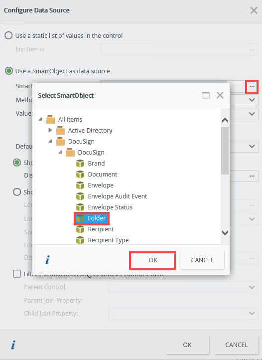 - The Configure Data Source page shows. In the Use a SmartObject as data source section, click the SmartObject ellipsis to select the Folder SmartObject located within the DocuSign category. Click OK.