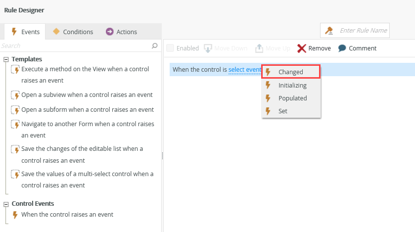 - On the Rule Designer page, click the select event link and then select Changed.