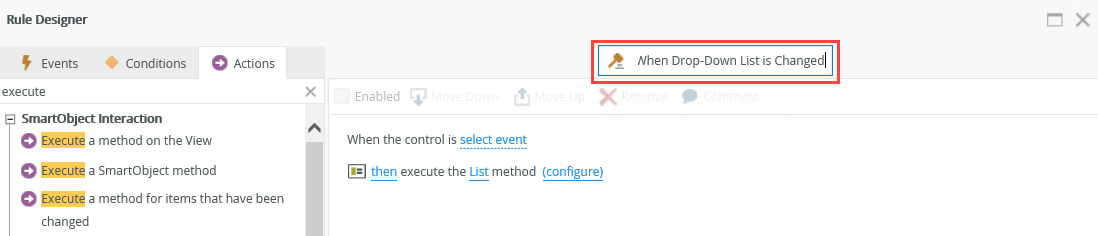 - Add a name for this rule, such as When Drop-Down List is Changed. Click OK to close the Rule Designer.