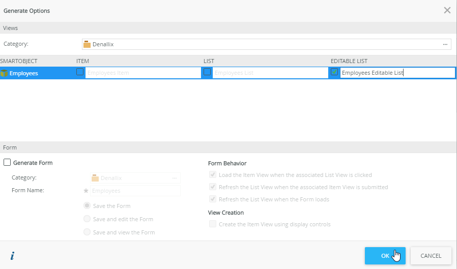 - On the Employees SmartObject page click Generate a View.