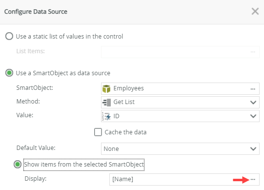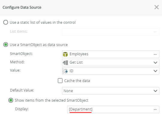 - Confirm that the SmartObject data source is configured to the Get List method with the ID value, and that the Name field is selected for the Display value. Click OK.