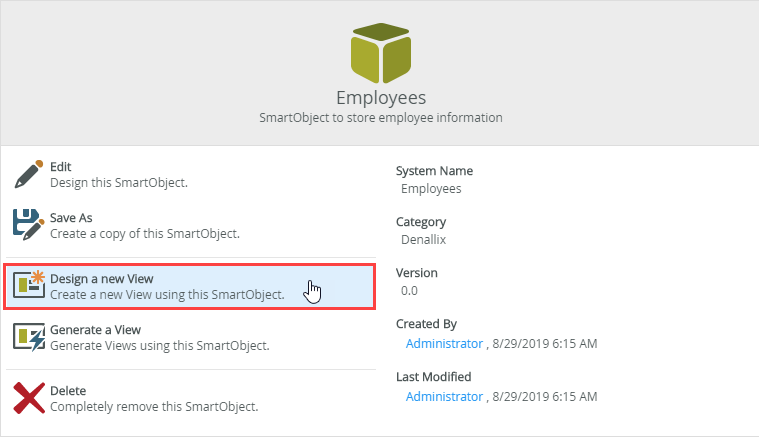 - On the Employees SmartObject page click Design a new View.