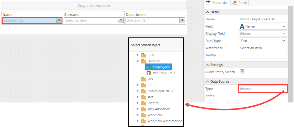 - Next select the Surname Drop-Down List control and configure the Employees SmartObject as the data source.