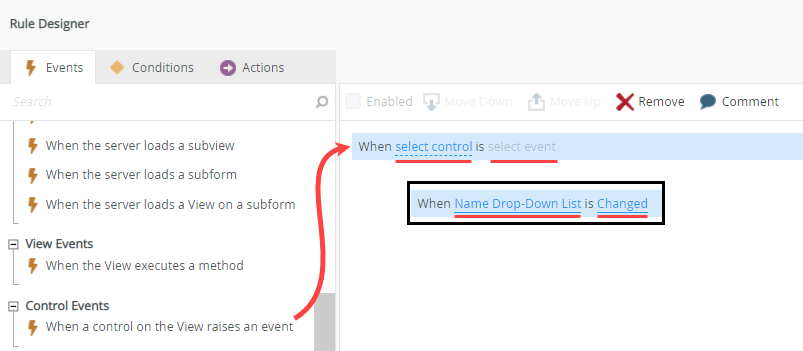 - With the Events tab selected, click When a control on the View raises an event. Select Name Drop-Down List and Changed.