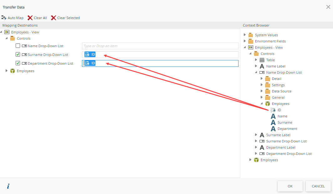 - In the Context Browser, expand to Controls > Name Drop-Down List > Employees SmartObject. Drag and drop the ID property of the SmartObject to the Surname Drop-Down List and to the Department Drop-Down List controls. This creates the mapping to load the data associated with the selected name, using ID as the common property. Click OK and OK to save the configuration and rule, and Finish to save and exit the view.