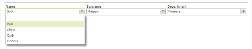- Add a rule to populate the data of the Surname and Department drop-down lists using the selected Name. This loads the surname and department values of the selected employee name.