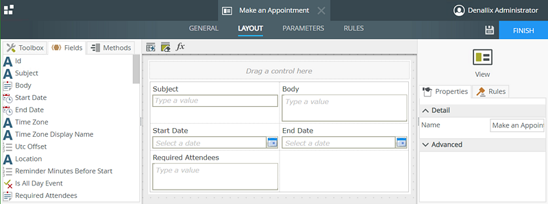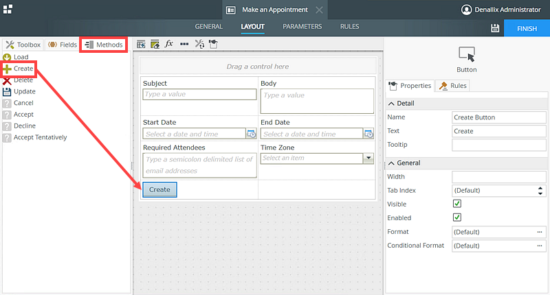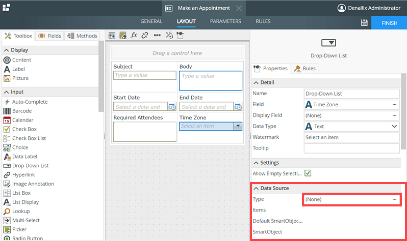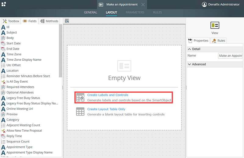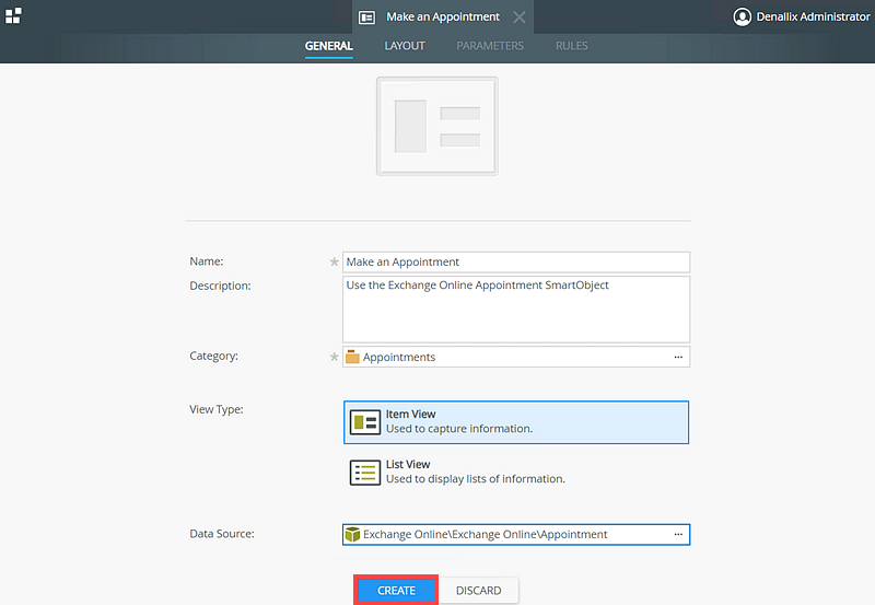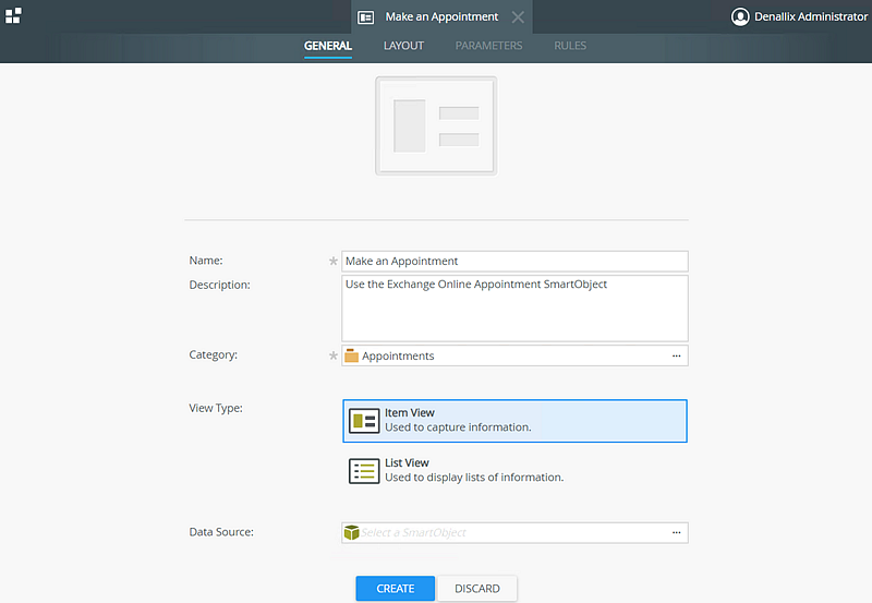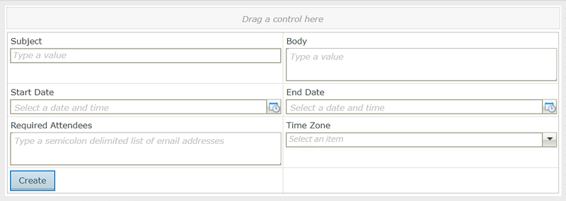 In this scenario, you build a Make an Appointment form using the Create method of the Appointment SmartObject. The Make an Appointment form captures appointment information such as the subject, start date, end date, and time zone of the appointment, and a list of attendees.