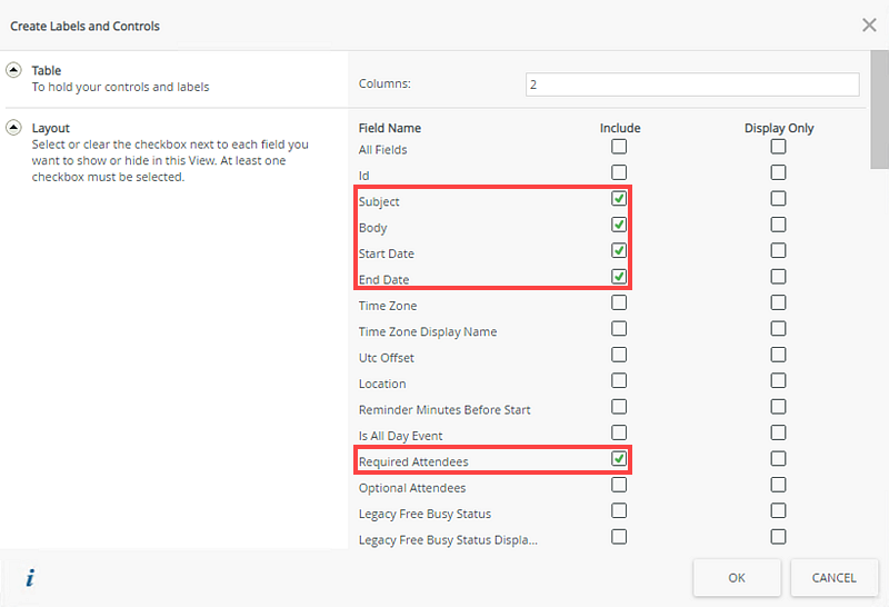 - Select to include the Subject, Body, Start Date, End Date, and Required Attendees fields.