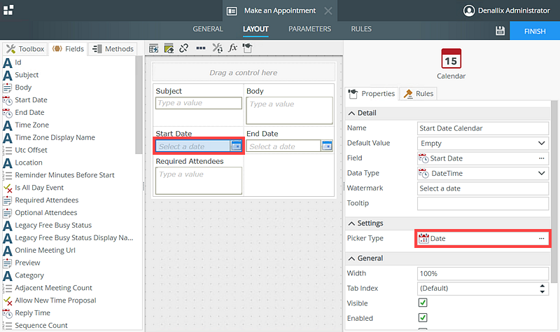 - Select the Start Date calender control and click the Picker Type setting.