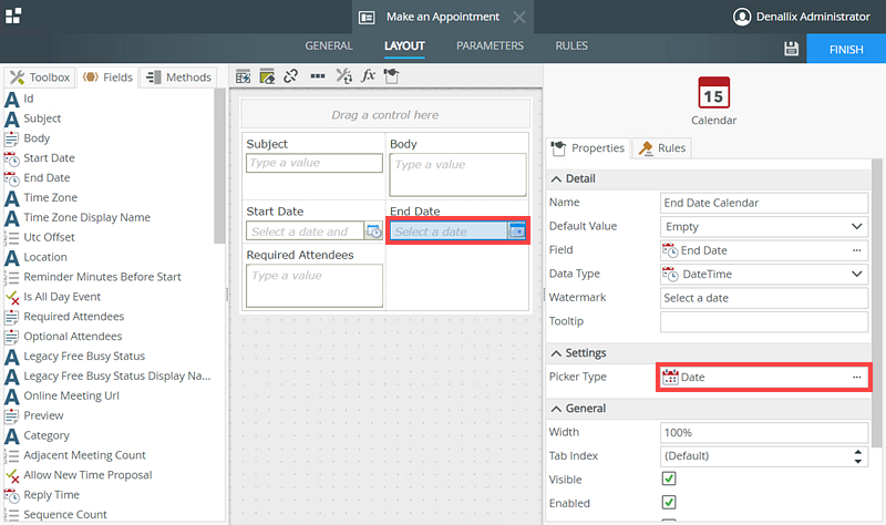 - Select the End Date calender control and click the Picker Type setting.