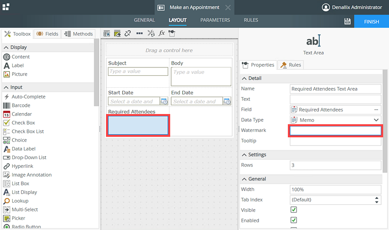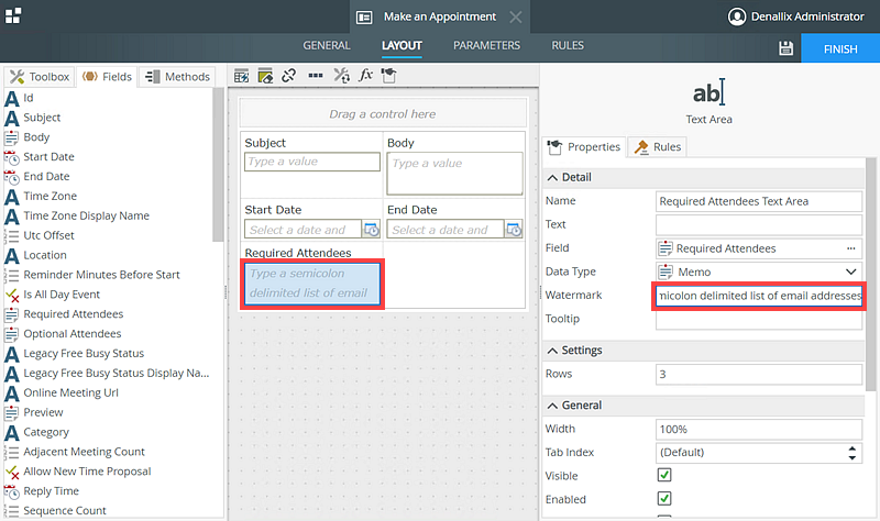 - Select the Required Attendees text area control and change the Watermark to Type a semicolon delimited list of email addresses.