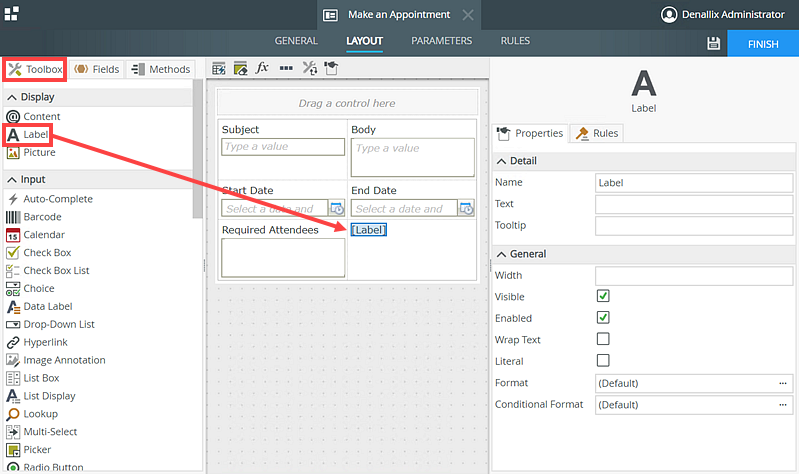 - Select the view Toolbox tab and drag a Label control on the empty cell below End Date.