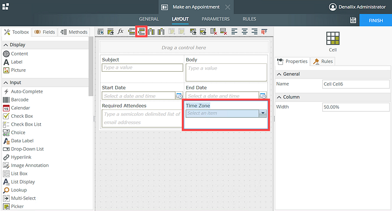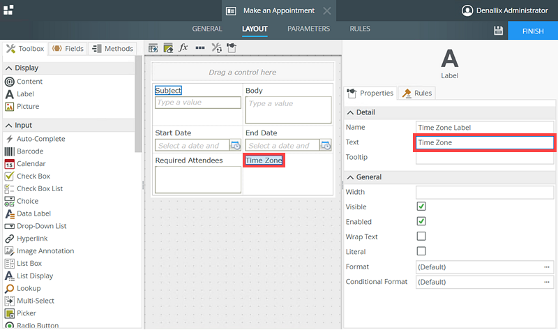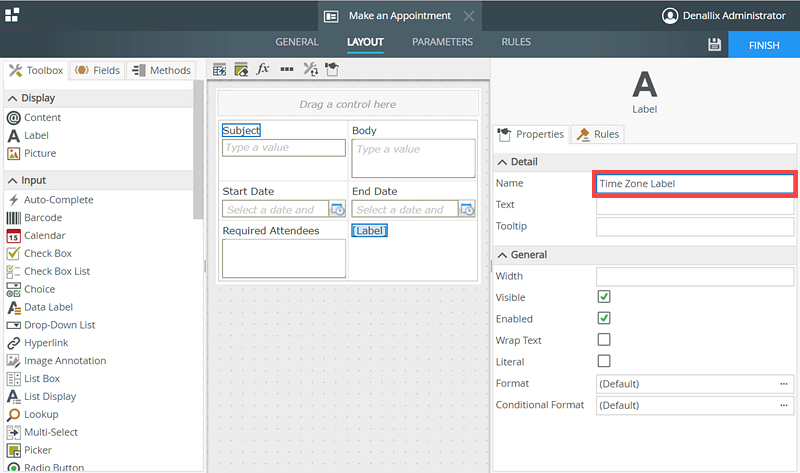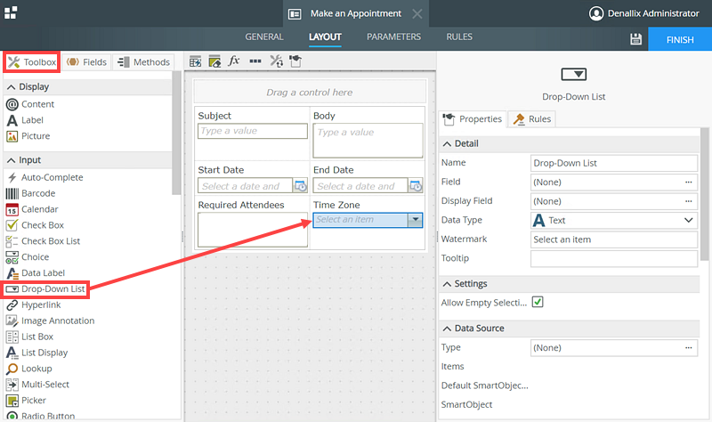 - Select the Drop-Down List control from the Toolbox and drag it below the Time Zone Label.