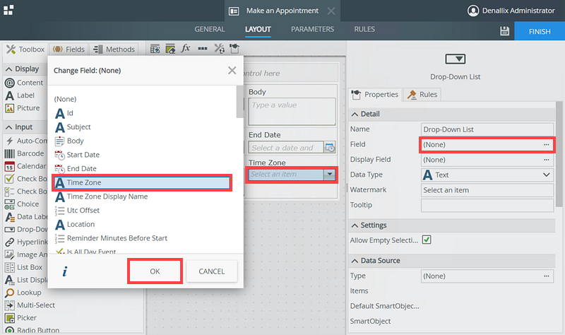 - Configure the Drop-Down List to use Time Zone for the field.
