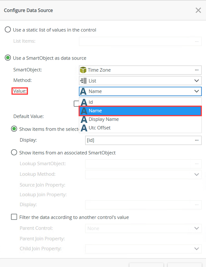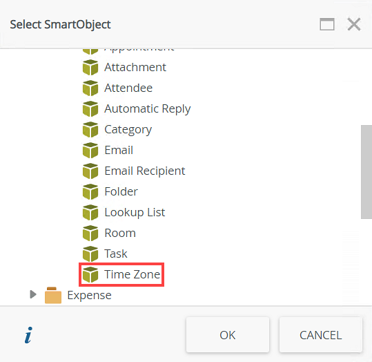 - Select the Time Zone SmartObject as the data source and click OK.