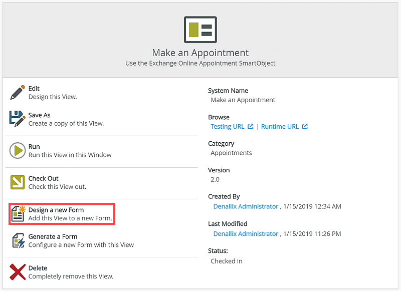 From the Make an Appointment view page, select the Design a new Form option.