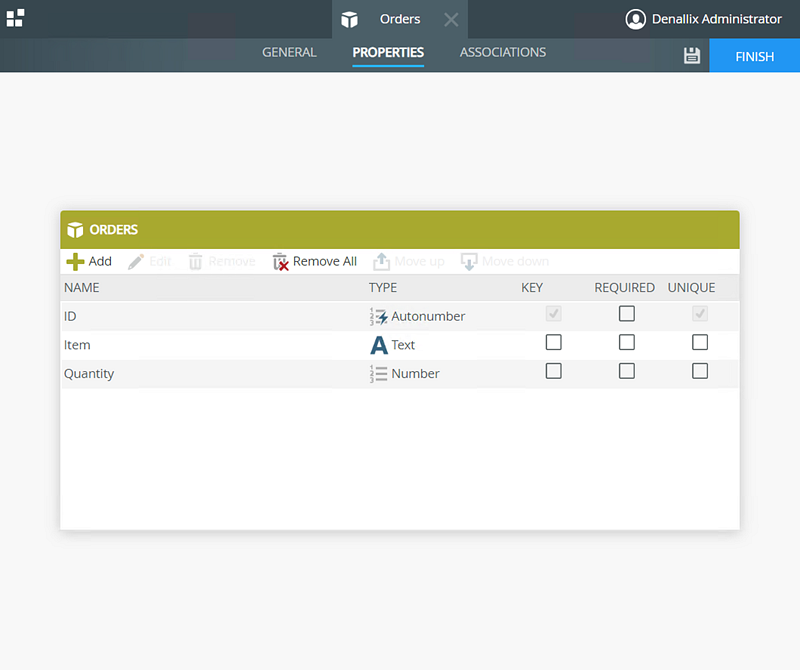 Order SMO Properties Type Key Required Unique ID Autonumber Yes No Yes Item Text No No No Quantity Number No No No - Click Finish to save the SmartObject