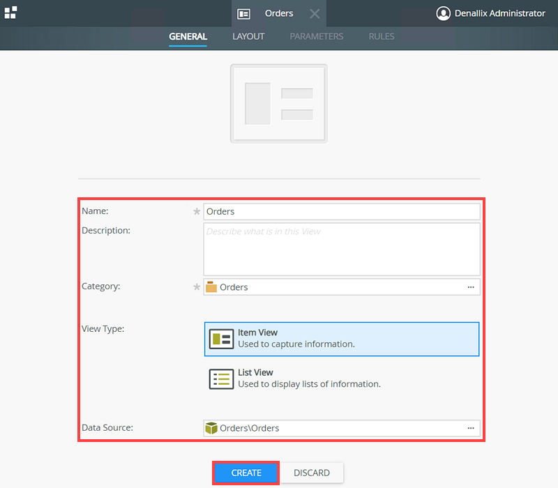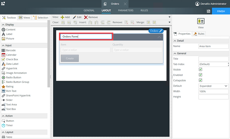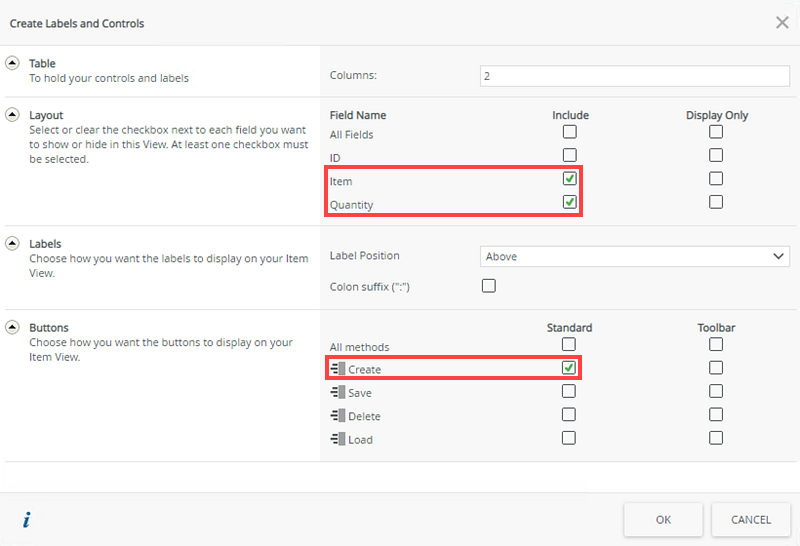 - Select Item and Quantity fields for the layout and select the Create method for the button. Click OK.