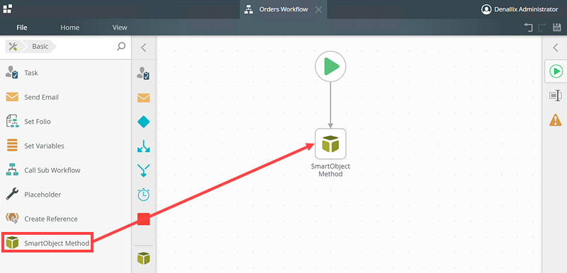 - From the left side of the workflow designer, select the SmartObject Method step and drag in onto the canvas.