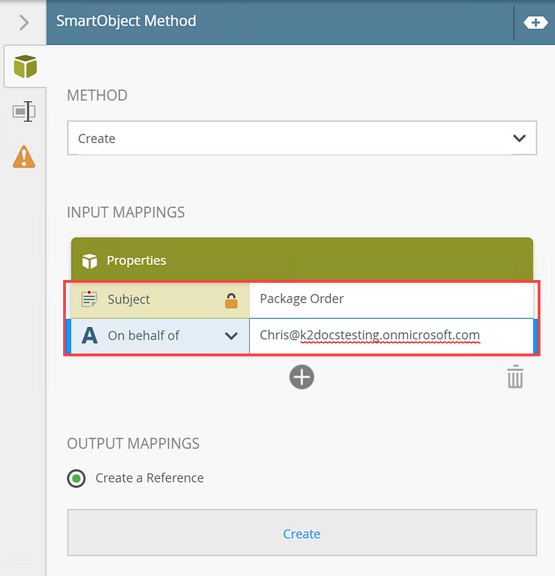 - Expand the SmartObject event configuration and add the On behalf of parameter.