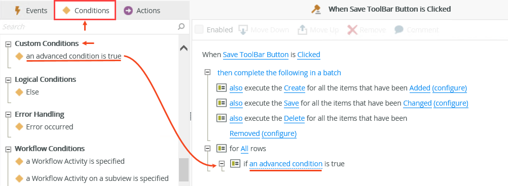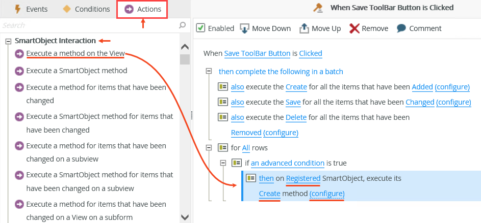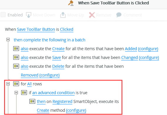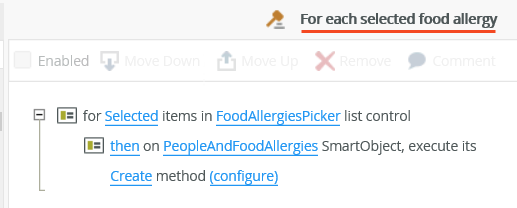 You can use the For-Each Looping conditions on list views and list controls to perform actions for all items that meet a specified condition, such as to remove selected records from a list or execute a create method for all items when a condition is true. Use looping conditions with other If conditions or on their own.