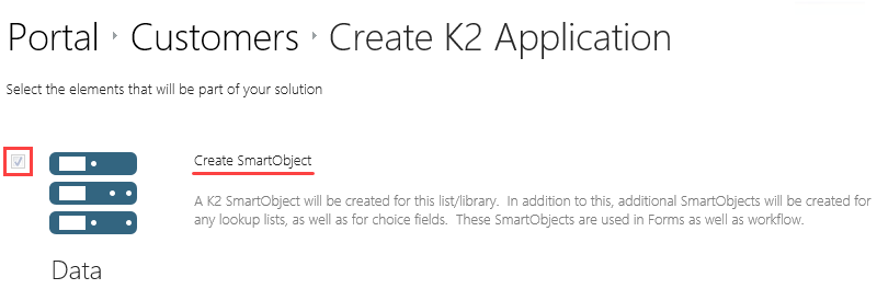 6. On the Create K2 Application page, notice that K2 creates the Data element by default (a SmartObject).