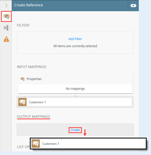5. Scroll down and locate the Output Mappings heading. Click Create. You see the Customers 1 reference. This reference points to each list item (by ID). Now, you have a reference to the list and a reference to each list item.