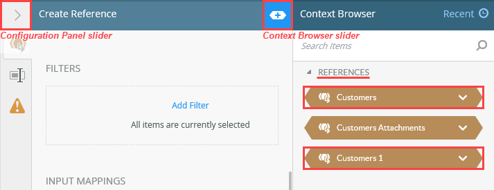 7. Notice the references include the Customers reference to the list and the Customers 1 reference to list items. You use the Customers 1 reference in the next step, where you loop through each list item. Collapse the Context Browser by clicking its slider. Collapse the Configuration Panel by clicking its slider.