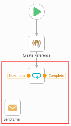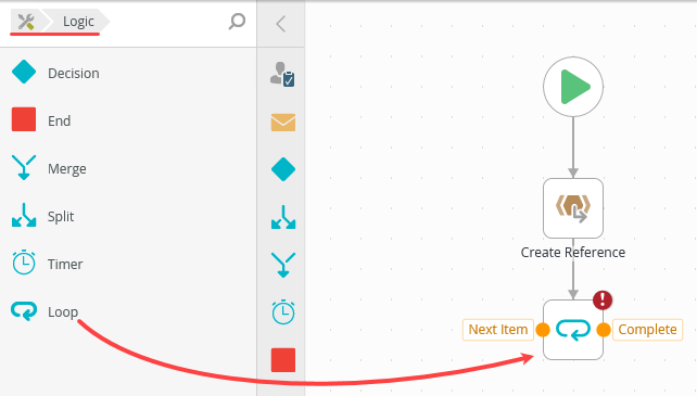 1. From the Toolbox > Logic node, drag a Loop step just below the Create Reference step. Connect the two steps.