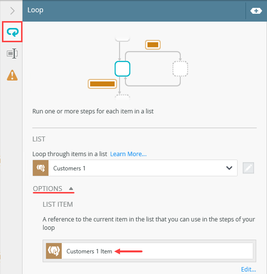 3. Expand the Options section. Notice the new reference, Customers 1 Item. This reference points to the current record (in the looping process) and makes it possible to use properties from this record in other steps. For example, you use the email property in the Send Email configuration later on. Collapse the Configuration Panel.