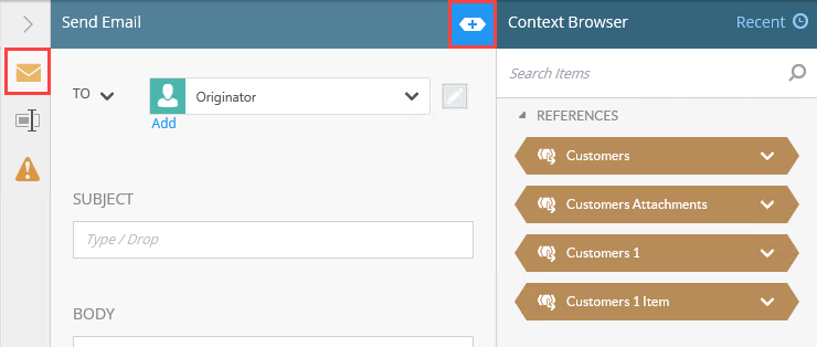 3. Select the Send Email step and expand the Configuration Panel. Select the Send Email tab if it is not already active. Expand the Context Browser.