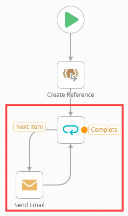 2. The Loop step generates two outcomes: Next Item and Complete. The workflow loops through steps connected to the Next Item outcome until it reaches the end of the referenced list. At that point, it follows the Complete outcome. Connect the Next Item outcome to the Send Email step. Connect the Send Email step back to the Loop step.